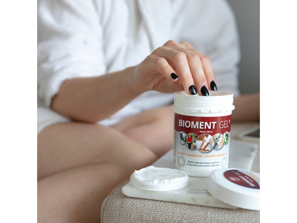 Bylinný masážní gel BIOMENT GEL® je kosmetický přípravek, který byl vyvinut ve spolupráci s maséry a určen k péči o pokožku po fyzické námaze, při rehabilitacích nebo u dlouhodobě ležících osob. Obsahuje kaštanový extrakt a rostlinné silice: eukalyptus, rozmarýn, mátu, levanduli, hřebíček, a které v kombinaci s masáží ulevují od pocitu unavených a namožených svalů. Vhodný k masáži pokožky v oblasti svalů po fyzické nebo sportovní aktivitě.